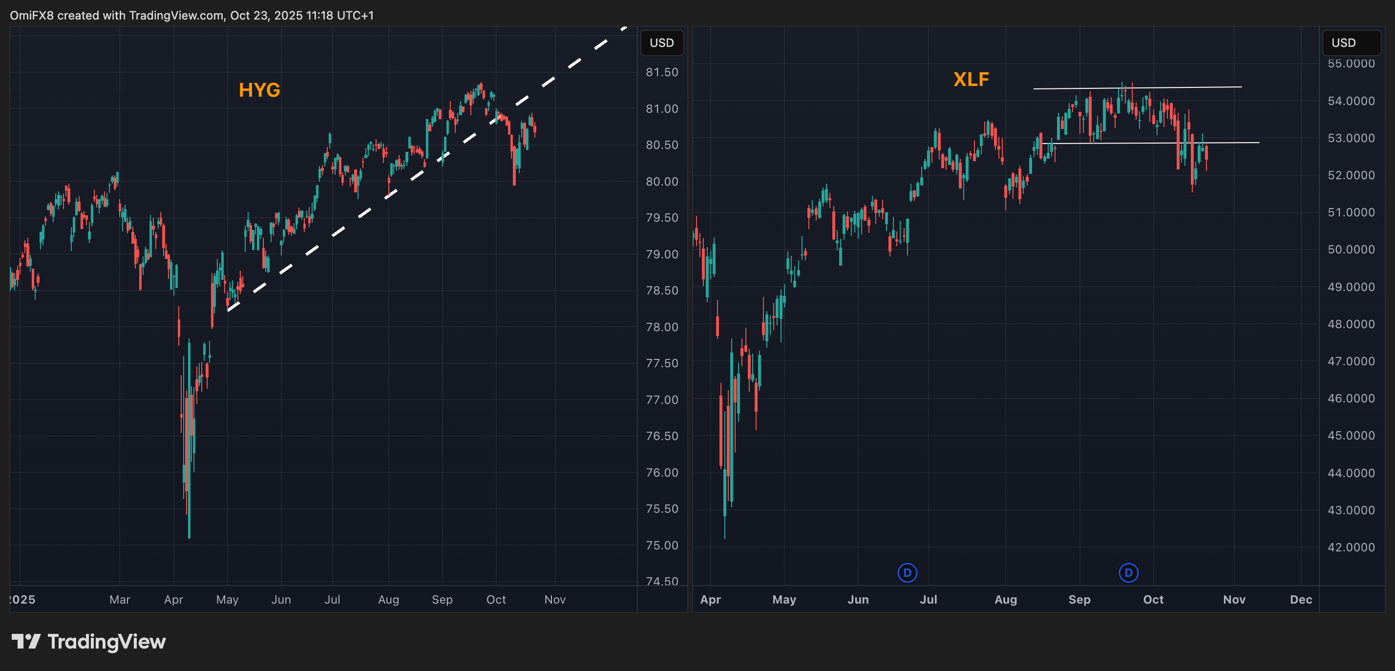 - iShares iBoxx High Yield Corporate Bond ETF (HYG) недавно провалился ниже восходящей линии тренда, сигнализируя о возобновлении доминирования продавцов. Падение настолько драматичное, что это практически цирковое представление. 🎪